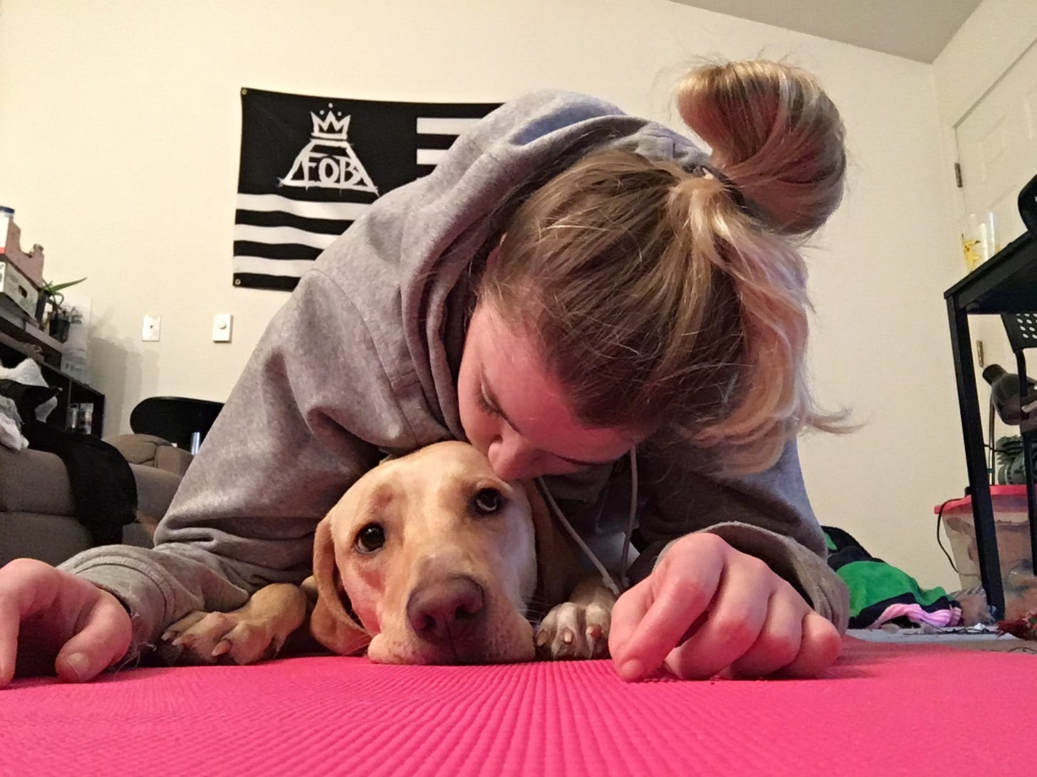 Here’s me at 26, a year after I got Cozy, and just a couple of days before I finished the first chapter of Going Coastal. I lived in that Green Bay Packers hoodie. I haven’t changed much. My hair’s shorter now. Cozy’s face is more white.